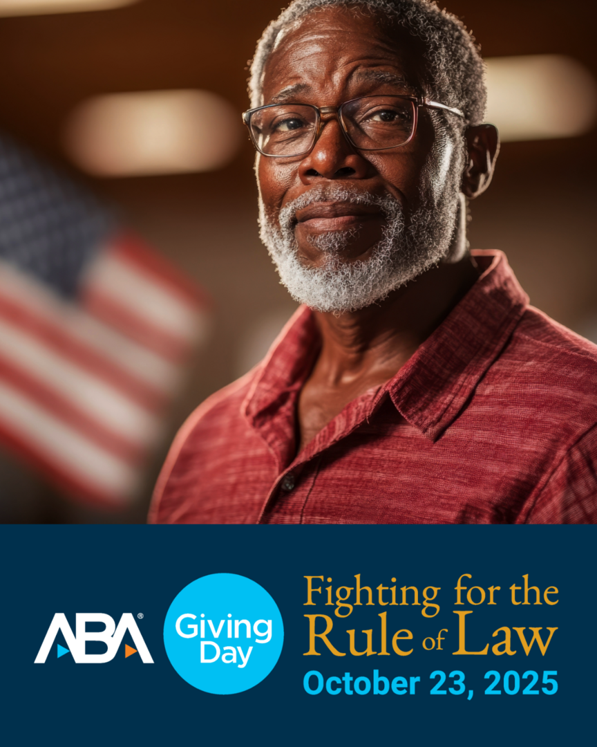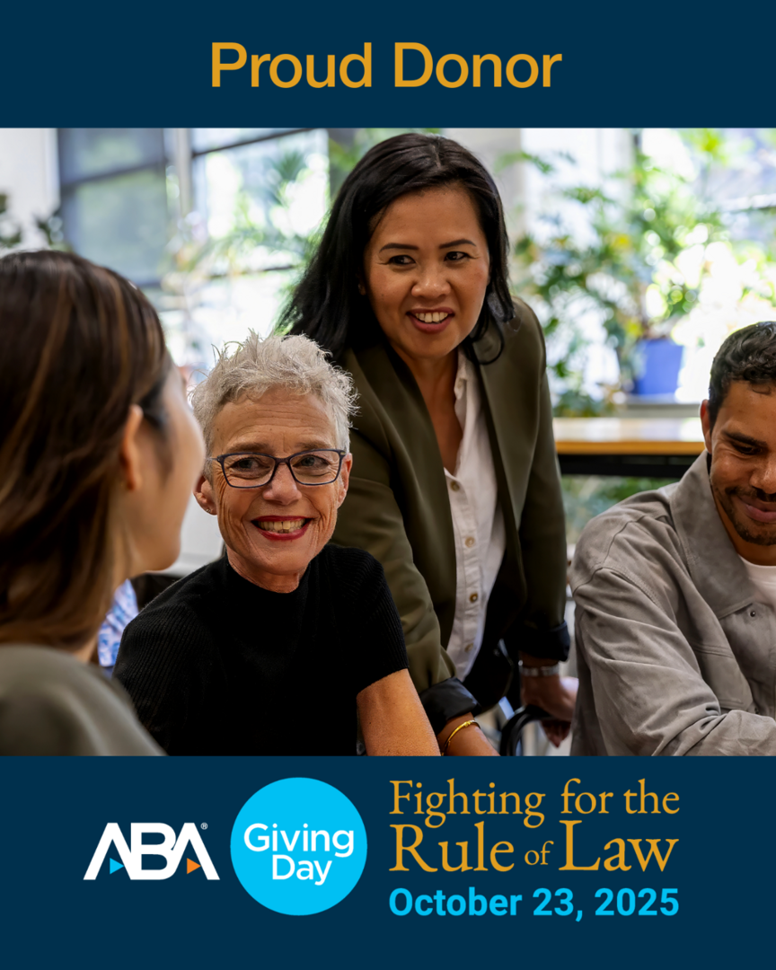 Access to justice is a fundamental right, yet many individuals, especially those from disadvantaged backgrounds, are unable to receive the legal services they need to live a safe and healthy life. ABA Giving Day is your opportunity to invest in a brighter, stronger, and more inclusive society. Use the tools provided below to engage your network of family, friends, and colleagues to make a tangible difference in the lives of countless individuals!